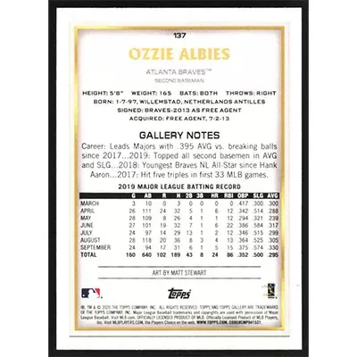 This is a 2020 Topps Gallery Ozzie Albies baseball card. The card is #137 and pictures show condition.
