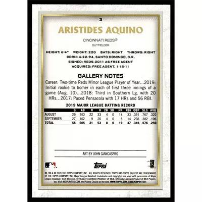 This is a 2020 Topps Gallery Aristides Aquino baseball card. The card is #3 and pictures show condition.