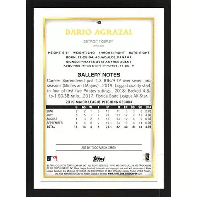 This is a 2020 Topps Gallery Dario Agrazal baseball card. The card is #42 and pictures show condition.