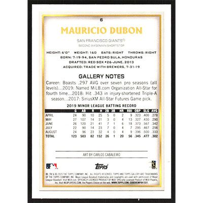 This is a 2020 Topps Gallery Mauricio Dubon baseball card. The card is #6 and pictures show condition. Team(s): San Francisco Giants Rookie Card (RC)