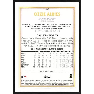 This is a 2020 Topps Gallery Artist Proof Ozzie Albies baseball card. The card is #137 and pictures show condition.
