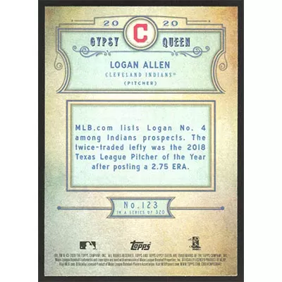 This is a 2020 Topps Gypsy Queen Logan Allen baseball card. The card is #123 and pictures show condition. Team(s): Cleveland Indians Rookie Card (RC)