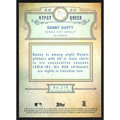 This is a 2020 Topps Gypsy Queen Danny Duffy baseball card. The card is #214 and pictures show condition.