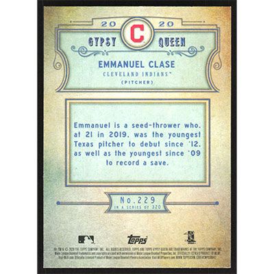 This is a 2020 Topps Gypsy Queen Emmanuel Clase baseball card. The card is #229 and pictures show condition. Team(s): Cleveland Indians Rookie Card (RC)