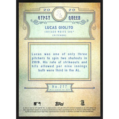 This is a 2020 Topps Gypsy Queen Lucas Giolito baseball card. The card is #277 and pictures show condition.