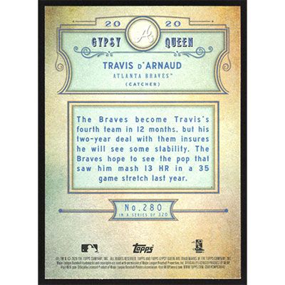 This is a 2020 Topps Gypsy Queen Travis d'Arnaud baseball card. The card is #280 and pictures show condition.