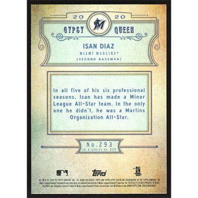 This is a 2020 Topps Gypsy Queen Isan Diaz baseball card. The card is #293 and pictures show condition.