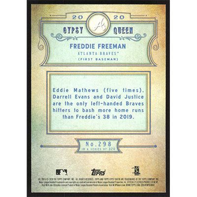 This is a 2020 Topps Gypsy Queen Freddie Freeman baseball card. The card is #298 and pictures show condition.