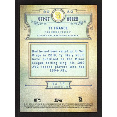 This is a 2020 Topps Gypsy Queen Ty France baseball card. The card is #58 and pictures show condition.