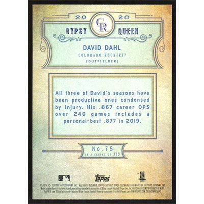 This is a 2020 Topps Gypsy Queen David Dahl baseball card. The card is #75 and pictures show condition.