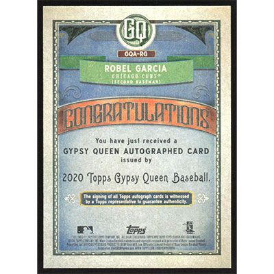 This is a 2020 Topps Gypsy Queen Autographs Robel Garcia baseball card. The card is #GQA-RG and pictures show condition. Team(s): Chicago Cubs Rookie Card (RC)