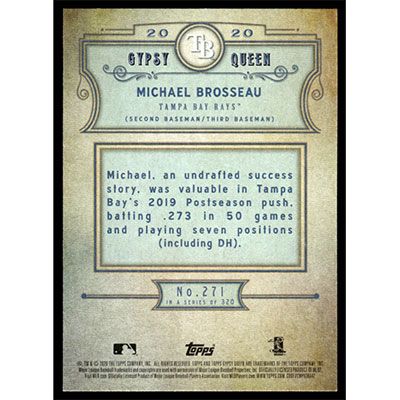 This is a 2020 Topps Gypsy Queen Green Michael Brosseau baseball card. The card is #271 and pictures show condition. Team(s): Tampa Bay Rays Rookie Card (RC)