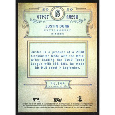 This is a 2020 Topps Gypsy Queen Silver Justin Dunn baseball card. The card is #144 and pictures show condition. Team(s): Seattle Mariners Rookie Card (RC)