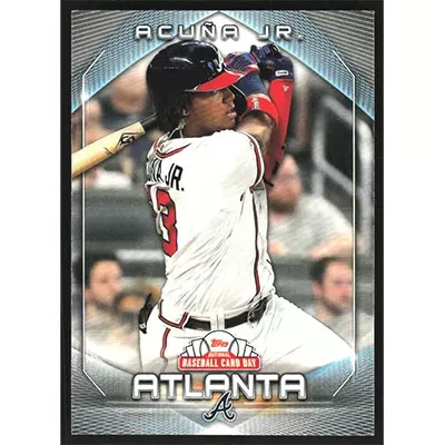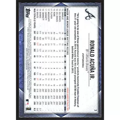 This is a 2020 Topps National Baseball Card Day Ronald Acuña Jr. baseball card. The card is #3 and pictures show condition.