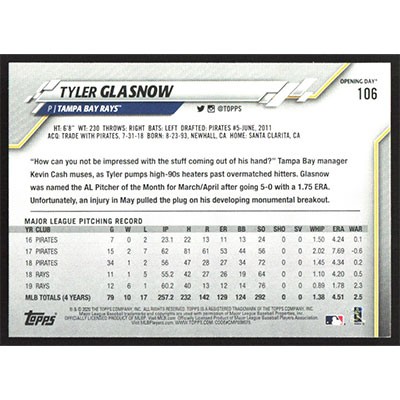 This is a 2020 Topps Opening Day Tyler Glasnow baseball card. The card is #106 and pictures show condition.