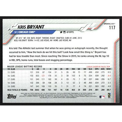 This is a 2020 Topps Opening Day Kris Bryant baseball card. The card is #117 and pictures show condition.