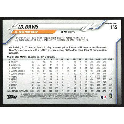This is a 2020 Topps Opening Day J.D. Davis baseball card. The card is #155 and pictures show condition.