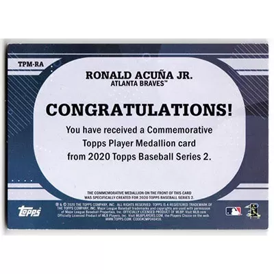 This is a 2020 Topps Player Medallions Ronald Acuña Jr. baseball card. The card is #TPM-RA and pictures show condition.