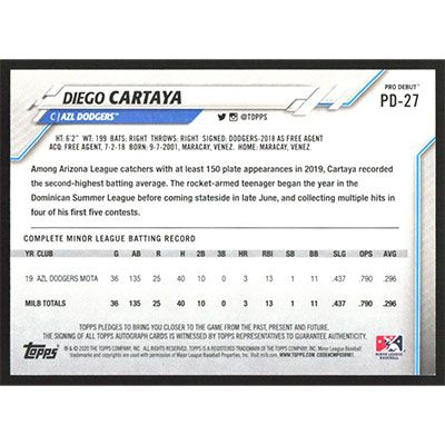 This is a 2020 Topps Pro Debut Autographs Diego Cartaya autographed baseball card. This card has been signed, in blue, by Diego Cartaya, and is certified authentic by Topps. The card is #PD-27 and pictures show condition.