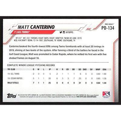 This is a 2020 Topps Pro Debut Matt Canterino baseball card. The card is #PD-134 and pictures show condition.