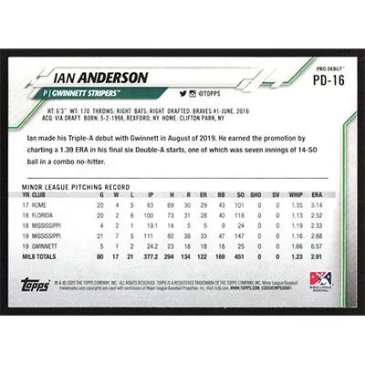 This is a 2020 Topps Pro Debut Ian Anderson baseball card. The card is #PD-16 and pictures show condition.
