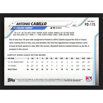 This is a 2020 Topps Pro Debut Antonio Cabello baseball card. The card is #PD-175 and pictures show condition.