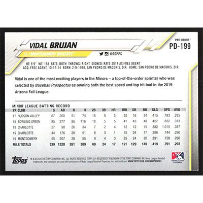 This is a 2020 Topps Pro Debut Vidal Brujan baseball card. The card is #PD-199 and pictures show condition.