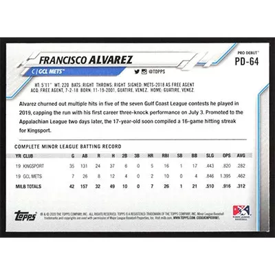 This is a 2020 Topps Pro Debut Francisco Alvarez baseball card. The card is #PD-64 and pictures show condition.