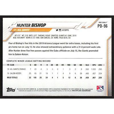 This is a 2020 Topps Pro Debut Hunter Bishop baseball card. The card is #PD-96 and pictures show condition.