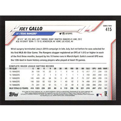This is a 2020 Topps Rainbow Foil Joey Gallo baseball card. The card is #415 and pictures show condition.