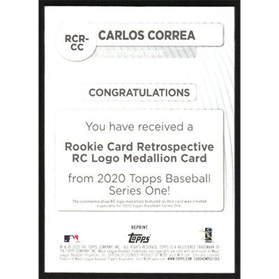 This is a 2020 Topps Rookie Card Retrospective RC Logo Medallions Carlos Correa baseball card. The card is #RCR-CC and pictures show condition. Team(s): Houston Astros