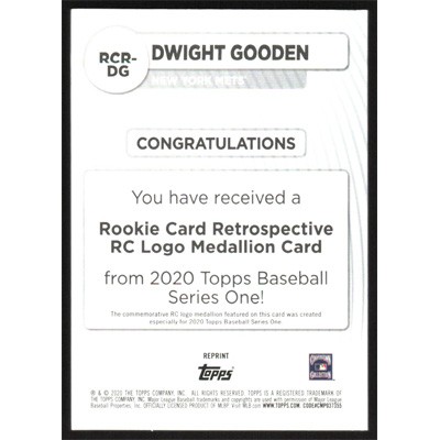 This is a 2020 Topps Rookie Card Retrospective RC Logo Medallions Dwight Gooden baseball card. The card is #RCR-DG and pictures show condition. Team(s): New York Mets