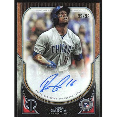 This is a 2020 Topps Tribute League Inauguration Autographs Robel Garcia autographed baseball card. This card has been signed, in blue, by Robel Garcia, and is certified authentic by Topps. The card is #LA-RG and pictures show condition. This card is limited; #'d 99/99.