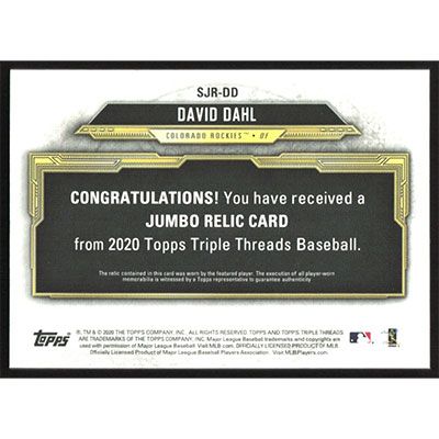 This is a 2020 Topps Triple Threads Single Jumbo Relic Amethyst David Dahl Jersey baseball card. The card is #SJR-DD and pictures show condition. This card is limited; #'d 11/27.