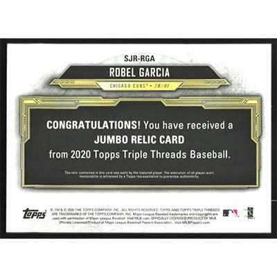 This is a 2020 Topps Triple Threads Single Relics Amethyst Robel Garcia Jersey w/ Pinstripe baseball card. The card is #SJR-RGA and pictures show condition. This card is limited; #'d 27-Aug.