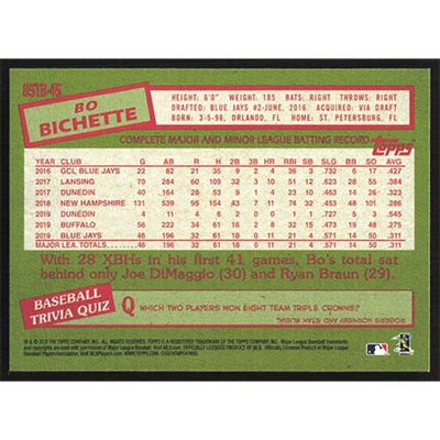 This is a 2020 Topps Update '85 Bo Bichette baseball card. The card is #85TB-45 and pictures show condition. Team(s): Toronto Blue Jays Rookie Card (RC)