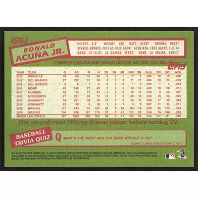 This is a 2020 Topps Update '85 Ronald Acuña Jr. baseball card. The card is #85TB-7 and pictures show condition.
