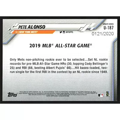 This is a 2020 Topps Update Gold Pete Alonso All-Star baseball card. The card is #U-187 and pictures show condition. This card is limited; #'d 0121/2020.