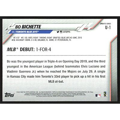 This is a 2020 Topps Update Rainbow Foil Bo Bichette Rookie Debut baseball card. The card is #U-1 and pictures show condition. Team(s): Toronto Blue Jays Rookie Card (RC)