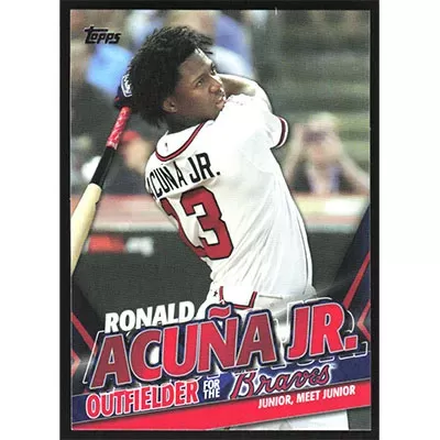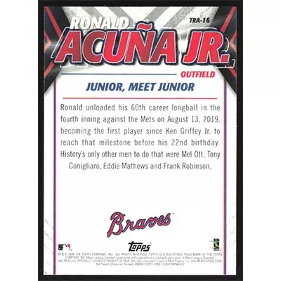This is a 2020 Topps Update Ronald Acuña Jr. Highlights baseball card. The card is #TRA-16 and pictures show condition.