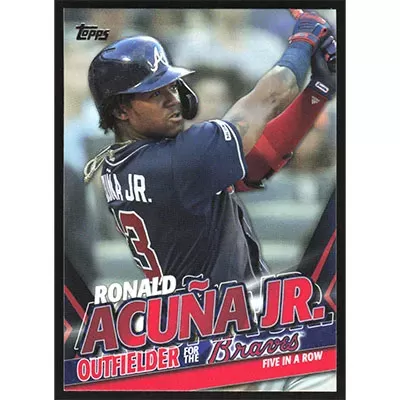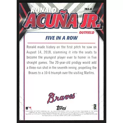 This is a 2020 Topps Update Ronald Acuña Jr. Highlights baseball card. The card is #TRA-6 and pictures show condition.