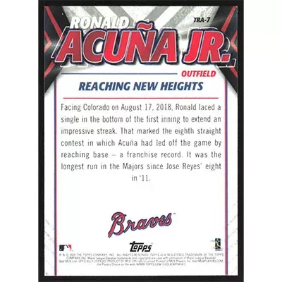 This is a 2020 Topps Update Ronald Acuña Jr. Highlights baseball card. The card is #TRA-7 and pictures show condition.