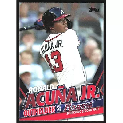 This is a 2020 Topps Update Ronald Acuña Jr. Highlights baseball card. The card is #TRA-9 and pictures show condition.