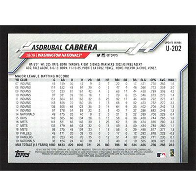 This is a 2020 Topps Update Target Red Asdrubal Cabrera baseball card. The card is #U-202 and pictures show condition.