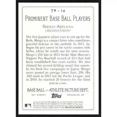 This is a 2020 Topps Update Turkey Red Shogo Akiyama baseball card. The card is #TR-14 and pictures show condition. Team(s): Cincinnati Reds Rookie Card (RC)