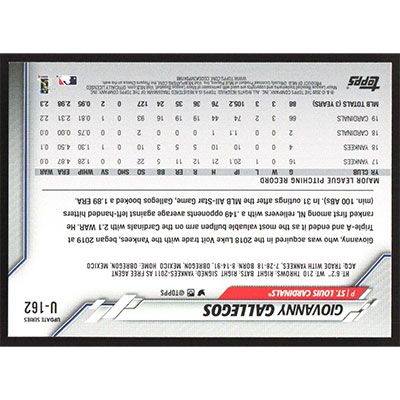 This is a 2020 Topps Update Giovanny Gallegos baseball card. The card is #U-162 and pictures show condition.