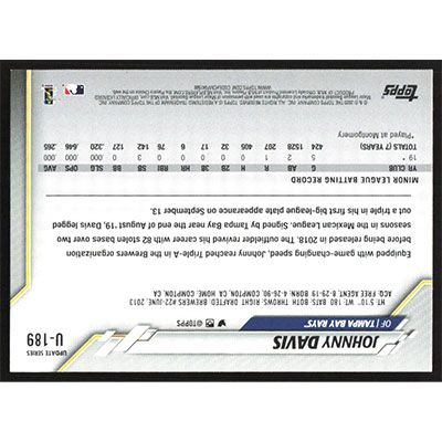 This is a 2020 Topps Update Johnny Davis baseball card. The card is #U-189 and pictures show condition.