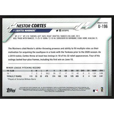 This is a 2020 Topps Update Nestor Cortes baseball card. The card is #U-196 and pictures show condition.