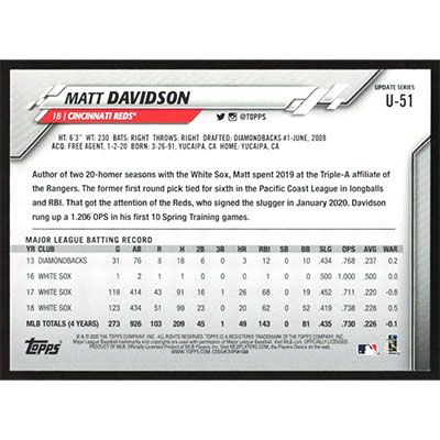 This is a 2020 Topps Update Matt Davidson baseball card. The card is #U-51 and pictures show condition.
