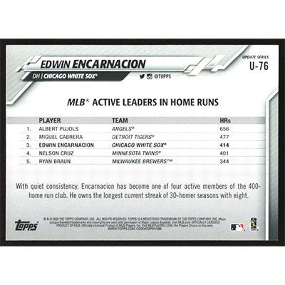 This is a 2020 Topps Update Edwin Encarnacion Active Leaders baseball card. The card is #U-76 and pictures show condition.